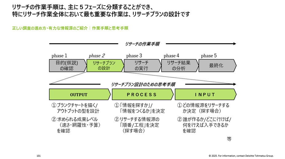 前半では、「調査」とは意思決定に足る客観的な情報や数字を収集し活用することであり、ビジネスの成功確率を高めるために効果的な手段であることを説明しました。また、リサーチには5つのフェーズがあり、その中でもリサーチプランの設計が最も重要な作業であること説明しました。また、リサーチ設計時点で「分析」まで想定できると、最終成果物の質が格段に高まることを紹介しました。