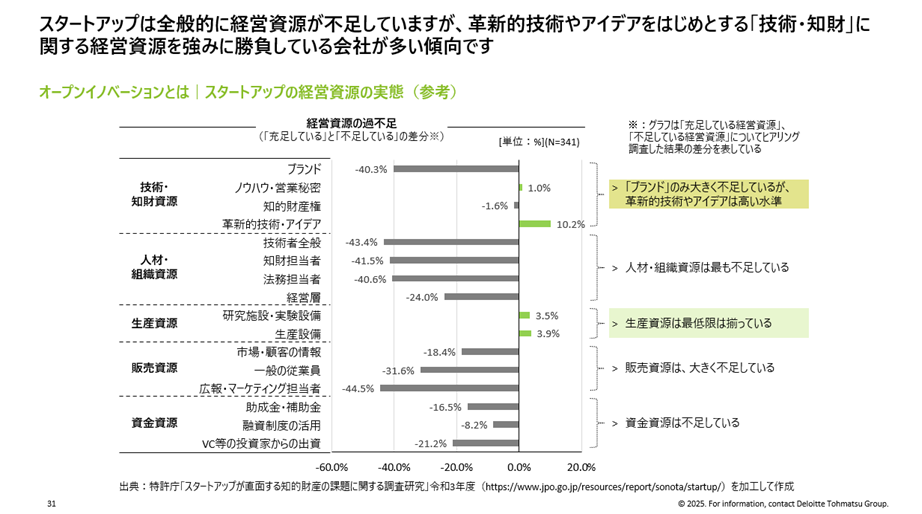 はじめに、オープンイノベーションの意義は「自社が持たない技術や知見の獲得」であり、企業にとってのメリットとして、外部資源の活用による新規事業などの収益増加、コスト削減・時間短縮等があることを紹介しました。また、オープンイノベーションの概念は「経営資源と経営資源を組み合わせてサービス開発や事業を創出する」ことであり、単なるサービスの導入や製品の購入はオープンイノベーションではないことを説明しました。その上で、成長する中小企業やスタートアップは、技術や知財の資源等を活用し、外部の経営資源を上手く組み合わせてオープンイノベーションを推進することが必要であることを、データを元に説明しました。