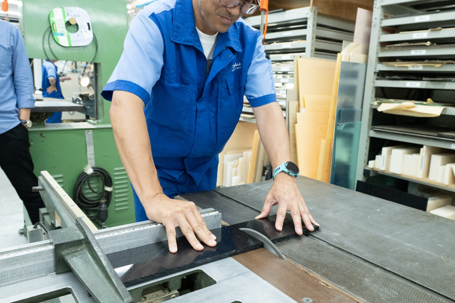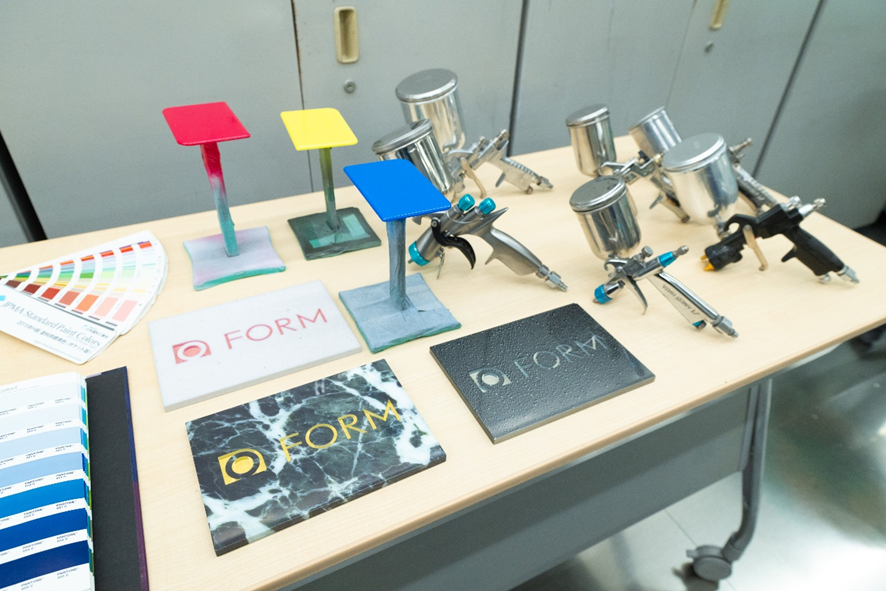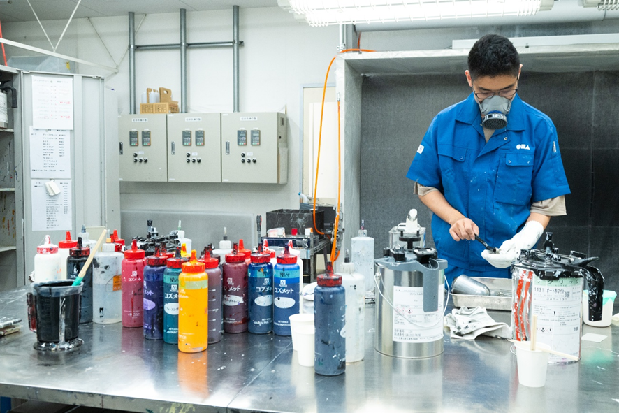 堀江:我々の最大の強みは、「塗装」や「表面処理」といった仕上げの技術にあります。社内には大きく4つの部隊があり、素材を削って加工する部隊、塗装などの表面処理を担う部隊、印刷を担当する部隊、そして最終的な組み立てを行う部隊が、それぞれ専門的に役割を分担しています。なかでも、高い技術力を誇っているのが、塗装と表面処理の分野です。塗装はスプレーガンという機器を使って塗料を吹きつけていくのですが、ただ素材に塗ればいいというわけではありません。表面が粗かったり仕上がりにムラが出たりすると、美しく見えないため、「磨き」や「仕上げ」といった工程を通して、滑らかで美しい表面に整える必要があります。私たちはこの“表面を整える”という部分にこだわってきました。たとえば、3Dプリンターで形を作って塗料を塗るだけでは、表面がザラついたり安っぽく見えたりします。そこで、本物同様の質感や色味を出したいとなったときに、私たちの技術が力を発揮します。