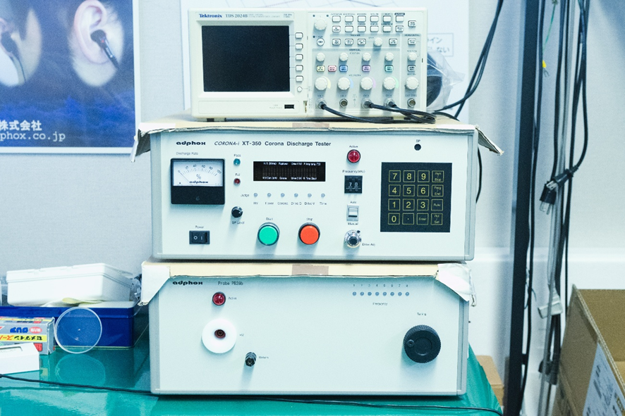 成沢:私が入社したちょうどその頃、『コロナ放電試験機』の開発依頼が舞い込みました。これが、後のアドフォクスを支える大きな柱となります。当時は、家電製品にインバーター技術(※2)が導入されはじめた時期で、電子レンジなどにもインバーター制御が使われるようになっていました。ところが、電子レンジが自らの内部部品を破損してしまうという問題が発生したんです。その原因が「コロナ放電」と呼ばれる現象で、トランス内部に高電圧がかかった際に微小な放電が起こり、これが絶縁体を劣化させてしまう。結果として製品寿命が大きく縮んでしまうんですね。そこで「この放電を検出できる試験機が欲しい」という要望をいただいたのがきっかけです。父はその依頼を受けて、「これはこれからの時代に絶対必要とされる試験機になる」と直感し、すぐに開発に乗り出しました。この製品は、まさにアドフォクスの主力事業となりました。今でも売上の半分を支えていると言っても過言ではありません。
