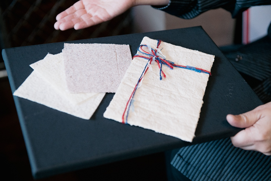 斉藤:作り方自体は、基本的に和紙とほとんど同じです。原材料はとてもシンプルで、主に花と葉と茎、水、そして糊。配合の85%以上はお花が占めています。こうして生まれた紙を『日本お花の紙』と呼んでいます。この紙の魅力は、まず「同じものが二度とできない」こと。引き取らせていただくお花は、イベントごとに種類も量も内容も異なるため、仕上がりは毎回まったく違った表情になります。茎が多ければ少し硬めになり、茎の茶色がそのまま紙に残ることもある。一方で、花びらを多く使うと、ふんわりと柔らかな質感になるんです。花びらと茎のバランスによって、色も手触りも大きく変わるので、正直なところ、完成するまでどうなるかは分かりません。その予測できなさも含めて、この紙ならではの個性だと思っています。